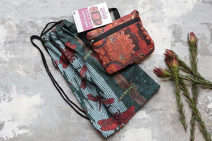 The duffle (photo right) features the artwork 'Madja' (Rainforest) from the Wurarr-wurrar (Dragonfly).