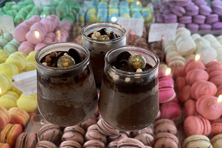 Flour Patisserie in Aisle G have macaroons in a variety of delicious flavours in packs of six or individually from $4. Creme Brulee, Nutella Rocher and French Vanilla are our favourites. There's also single chocolate mousse cups.