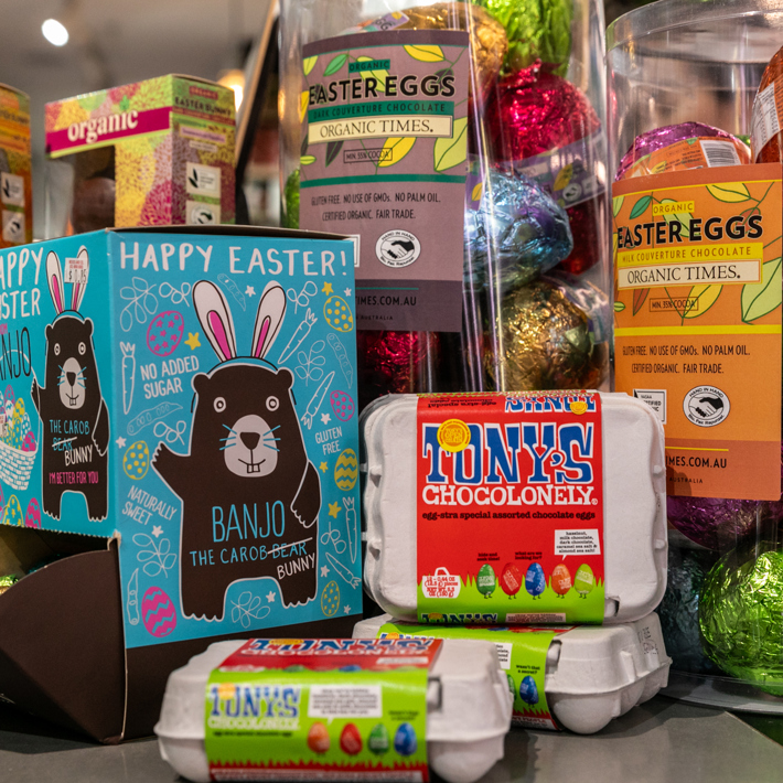 Moses and Co - Find limited edition Tony's Chocolonely egg-stra special chocolate eggs here, as well as organic chocolate bunnies, and gluten free chocolate eggs from the Carob Kitchen.