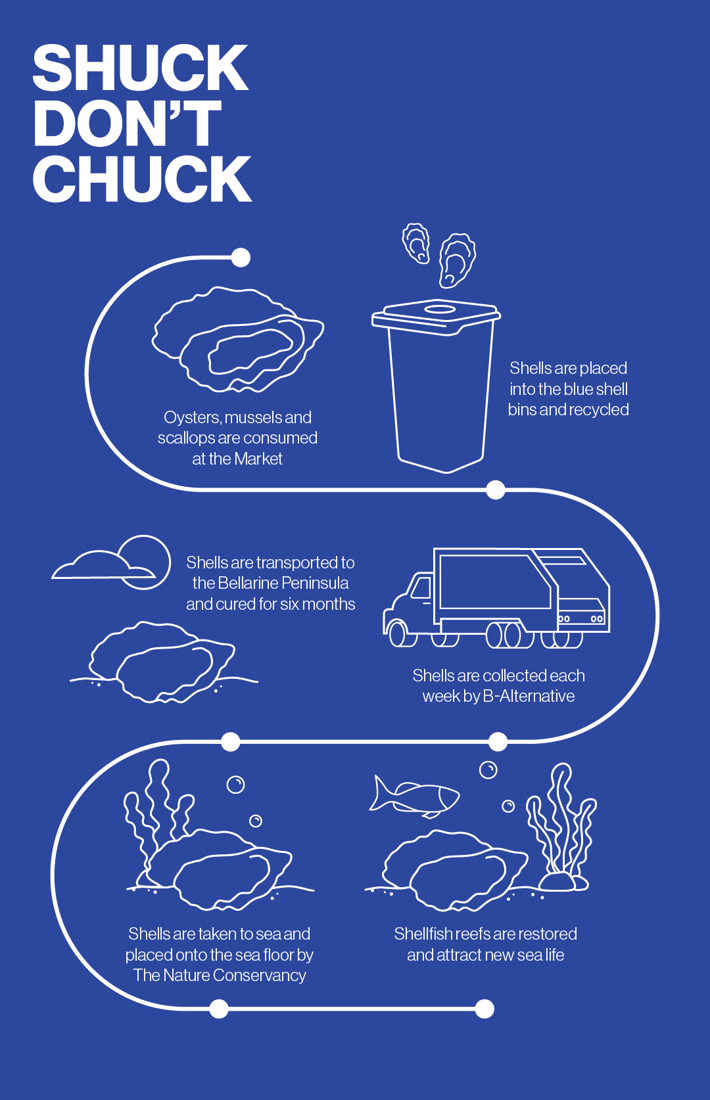 Since 2017, South Melbourne Market has partnered with The Nature Conservancy to recycle oyster shells as part of the Shuck Don't Chuck project.