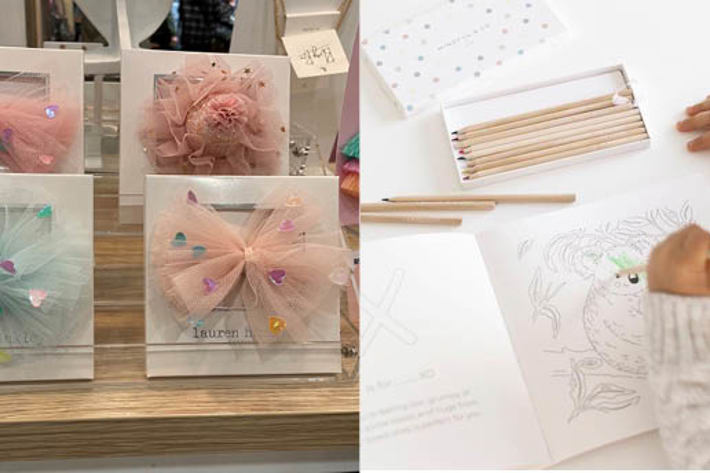 Bows from Ruby & Sky (left) Kids Mindfullness colouring book and pencils (right)