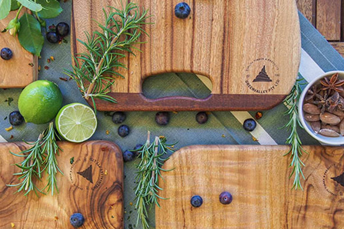 Green Valley Timber (Aisle D) - Camphor Laurel Chopping Boards, oval $95, round $80 or double handle $89. They harvest Camphor Laurel (an introduced species) for the replanting of native species and to protect our ecological system and save our planet.