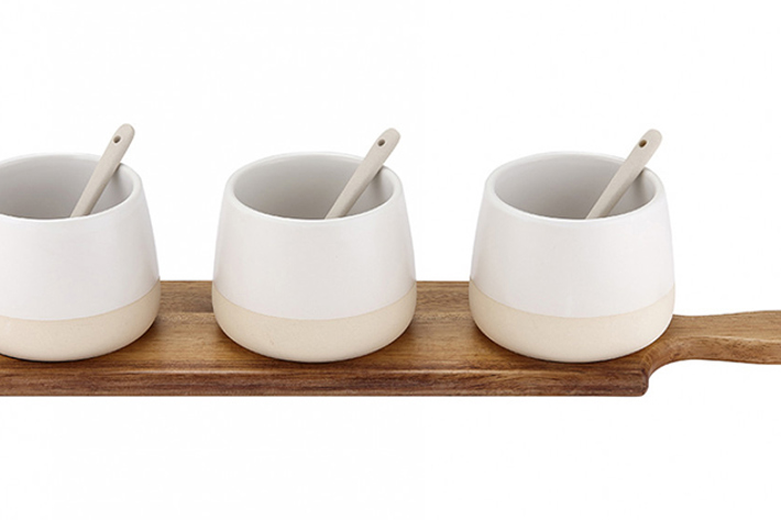 WB Smith and Co Kitchenware (Aisle G) - Ecology Aster Trio Dish Set with three dip bowls $29.95 or a Ladelle Host Bowl and Spoon Paddle with Wooden Tray (pictured) with three serving bowls and three spoons, $29.95.