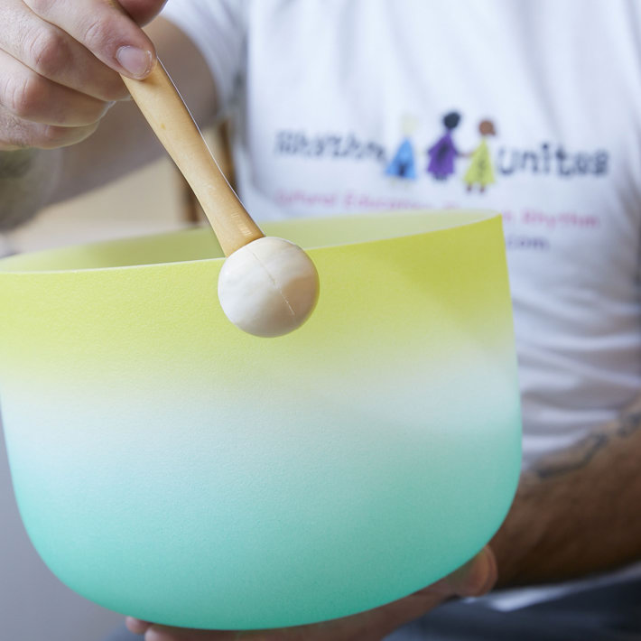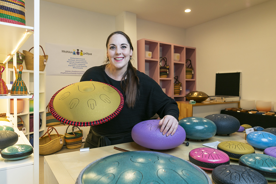 Michelle shows us a variety of their items: steel drums, ankle shakers, rain sticks, percussion pieces, djembe drums and crystal bowls. These are each attractive in their own right and beckon experimentation with their tactile materials and shapes, including a percussion piece shaped as a frog, its grooved spine forming the channel for sound. The crystal bowls are made of quartz and are especially alluring, they come in colourful gradients and correspond to distinct emotions and chakras. These are commonly known as healing bowls and have been used by Tibetan and Buddhist cultures for thousands of years. After a tragic life event, Jess practiced with the bowls and found significant healing in sound therapy. It is not a surprise that they are often used in professional yoga and meditation studios. They look beautiful and precious, but we are told that all of the instruments can last a lifetime if cared for properly.