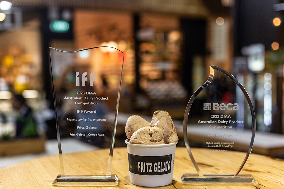 The Market's very own Fritz Gelato has won the Beca Award – Highest scoring gelati and IFF Award – Highest-scoring frozen product, both for their delicious Coffee Rush Gelato at the 2023 Dairy Industry Association of Australia (DIAA) Awards of Excellence Gala Dinner.