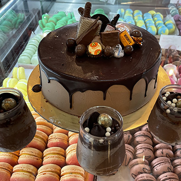 Flour Patisserie in Aisle G by the York Street entrance have eye catching sweet treats such as chocolate mousse cups, cup cakes, volcano chocolate mini cakes, brownies and slices. Their range of small and large cakes include flourless chocolate, chocolate and hazelnut baci, oreo and 'decadence'.