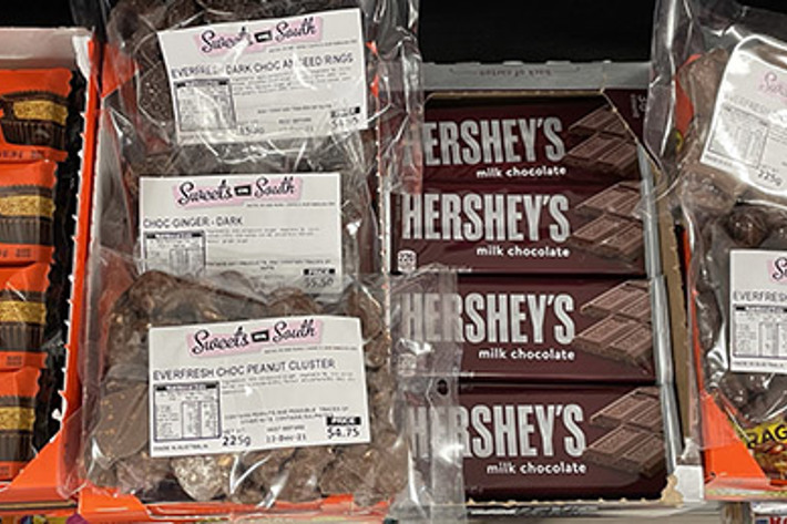 Sweets on South in Aisle C import quality sweets, chocolate and snacks from the UK, USA, New Zealand and Holland. You'll find Hershey bars, Wonka bars, Pink Lady individual chocolates (ginger, orange, caramel, raspberry and more), organic chocolate, sugar-free and other specialty products in store.