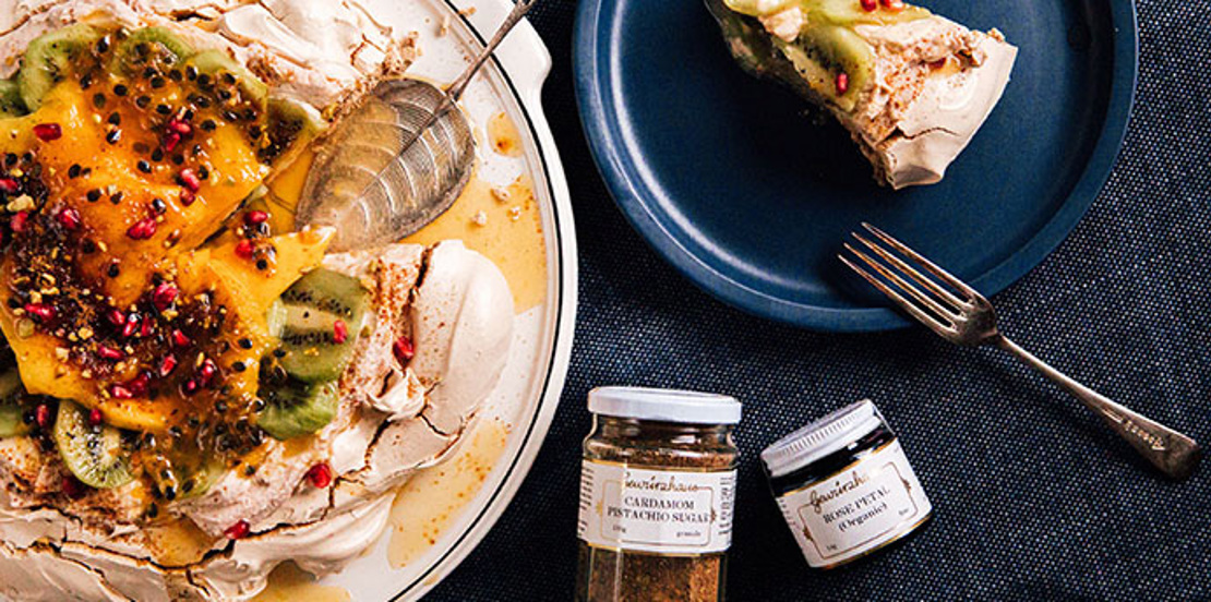 Cardamom Pistachio Pavlova with Rose Cream, Kiwifruit and Mango