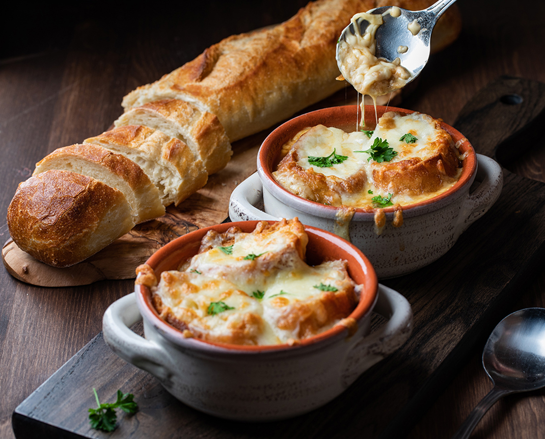 Position the baguette with cheese on top on a baking tray and grill – be careful not to burn it (you can use a day-old baguette if you don’t have a fresh one). Serve the soup in large bowls and put the cheesy baguette on top. Eat while very hot.