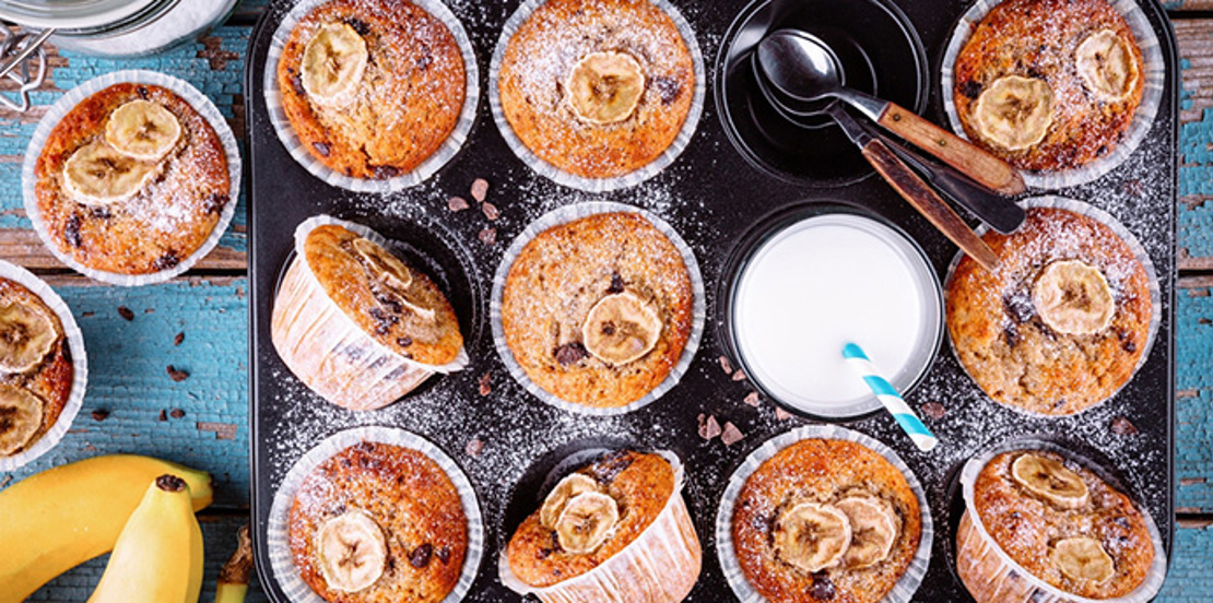 pide mixture among holes of prepared pans. Top muffins with a few slices of banana (optional).
