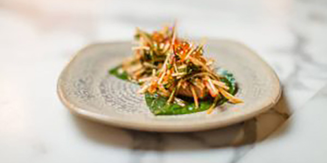 Put some miang sauce on betel leaf, then place seared scallop on leaf.