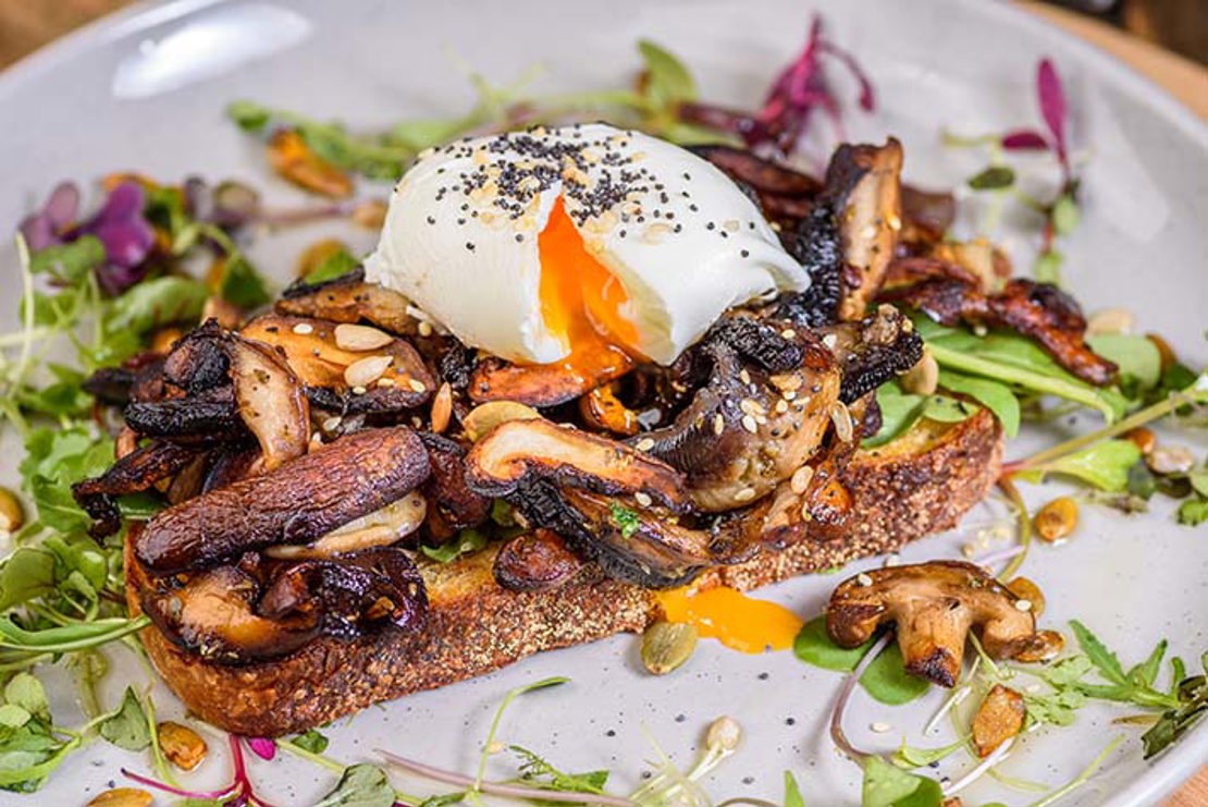 Place mushrooms and spinach on to hot toasted bread. Place poached egg on top and drizzle with truffle oil and garnish. Season to taste.