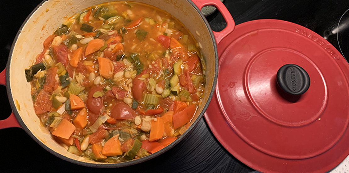 A veggie soup that's quick to make and great for a winter lunch paired with an Agathe Patisserie baguette.
