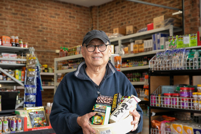 The image depicts a person in a store, holding various food items including a “FORTUNE COOKIE” box and a noodle package. They are standing in front of shelves stocked with an assortment of products such as canned goods, boxes, and bottles. The person is wearing a dark hoodie. The store has brick walls and appears to be a small grocery or convenience store.