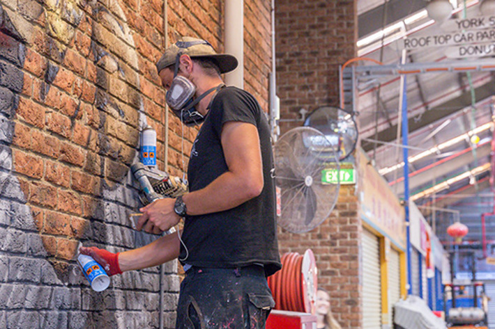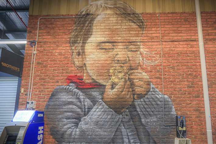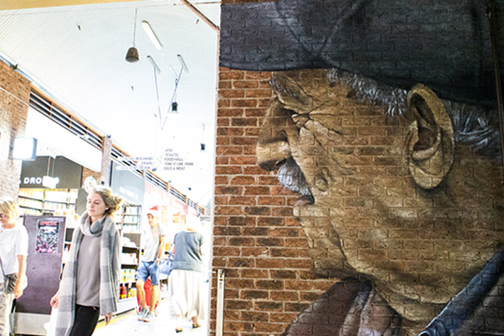 Artist Cam Scale created a series at the Market that highlights the generations of people from all backgrounds that have visited and worked here for 150 years. These faces represent the multicultural, 150-year heritage of the Market – where friendships have developed and memories have been created. Using aerosol and acrylic, Camscale painted four works on brick walls inside the Market.