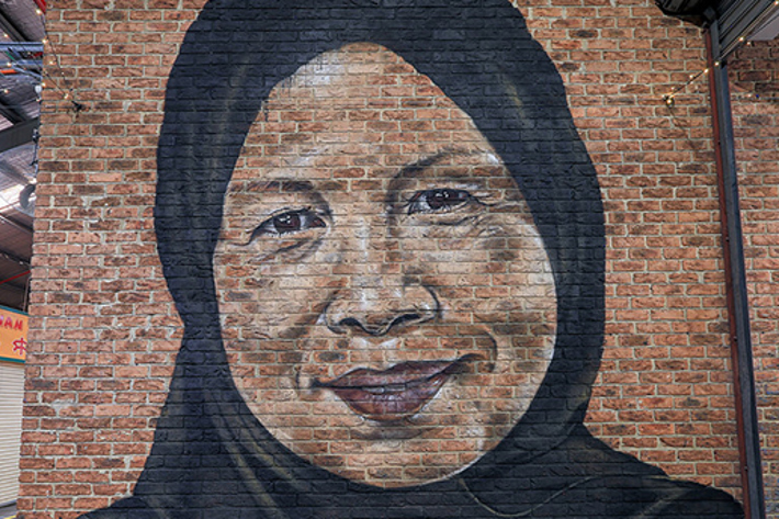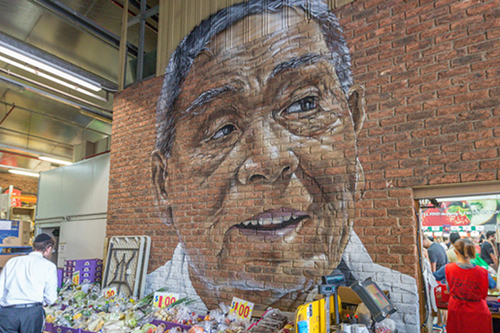 This mural of an older Chinese man represents an important part of the Market’s past. In the early 1900s, Coventry Street traders were predominantly Chinese, as seen in the Market collections register for 1927. This portrait reflects this rich history.