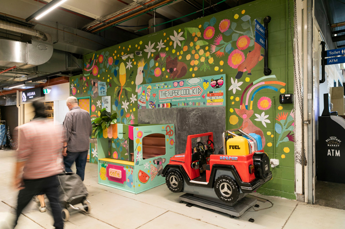 The Medley is a hand painted mural by Melbourne artist, Manda Lane, featuring a playful bouquet of fruit, vegetables and grains inspired by the stalls at South Melbourne Market.