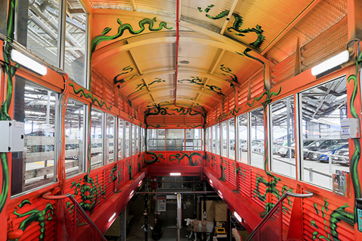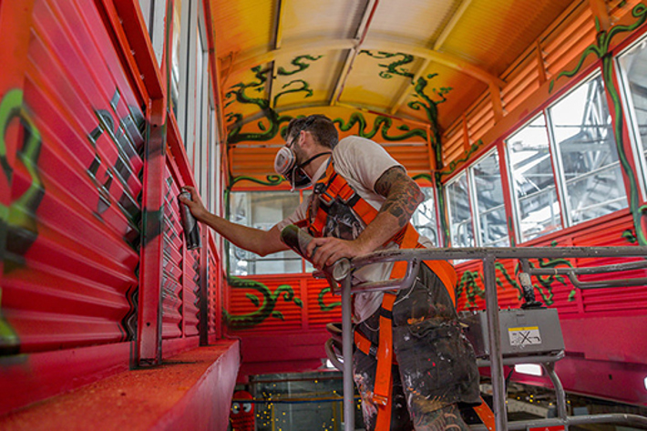 Artist Bailer created the stunning 'Greenhouse' in the stairway to the car park also using aerosol and acrylic. Bailer created a garden of vines twining around the poles and sides of the walls, reaching up to a sun drenched sky. The contrasting green of the vines and their direction going upwards leads the eye to the warmth and glow of the ceiling, the hues typical of a bright sunset in South Melbourne.