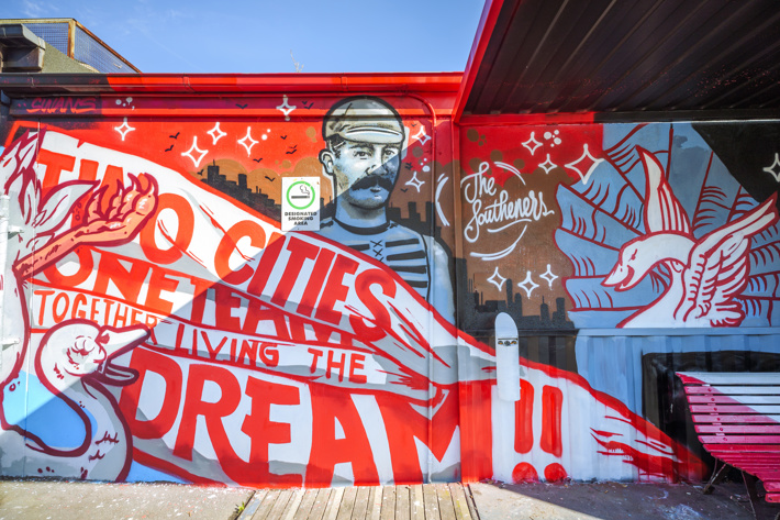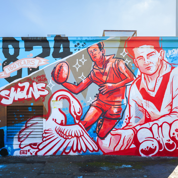 The artwork is a joint project between the Sydney Swans, the City of Port Phillip and South Melbourne Market and represents the club’s 150th year and features a selection of key figures from the club’s South Melbourne days.