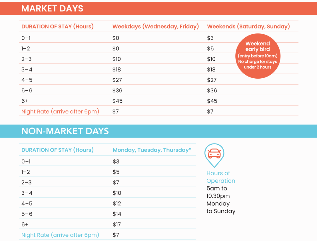 - *If the Market is open for an extra trading day (i.e. Monday, Tuesday, Thursday), the Market Day carpark rates will apply. Signage will indicate this at the carpark entry